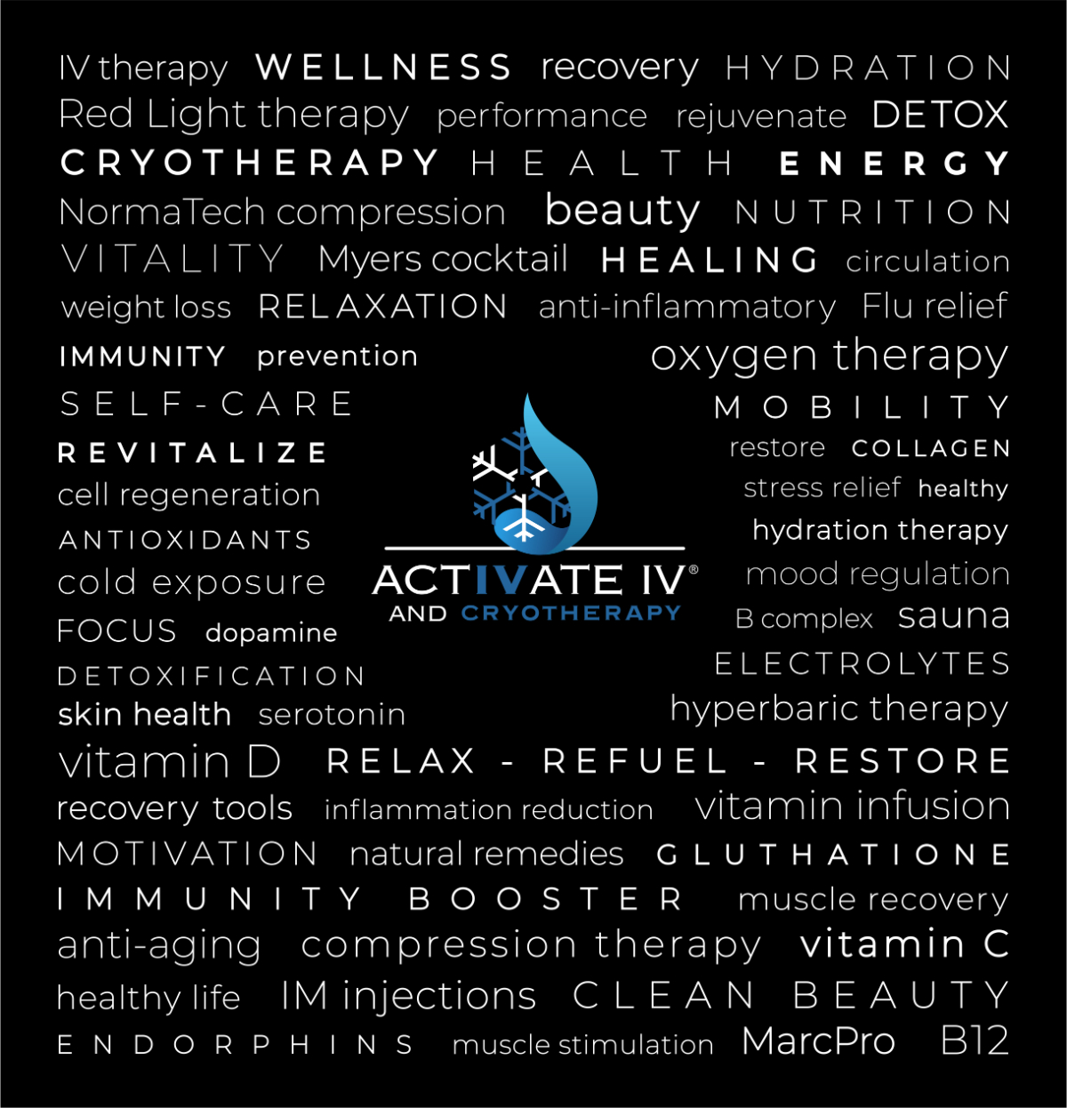 Activate IV and Cryotherapy is a wellness recovery center focused on getting you back to your A-game as fast as possible. We have assembled a great staff and have state-of-the-art technology to serve all your recovery needs. We provide wellness options for the high-end athlete looking for the competitive edge, the weekend warrior trying to stay healthy, the youth athlete trying to be their best, or anyone just wanting to live a healthier lifestyle.